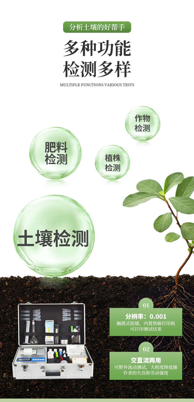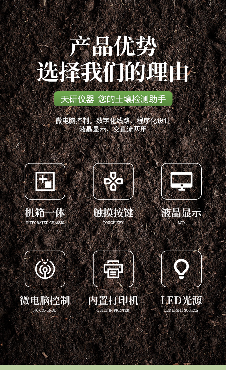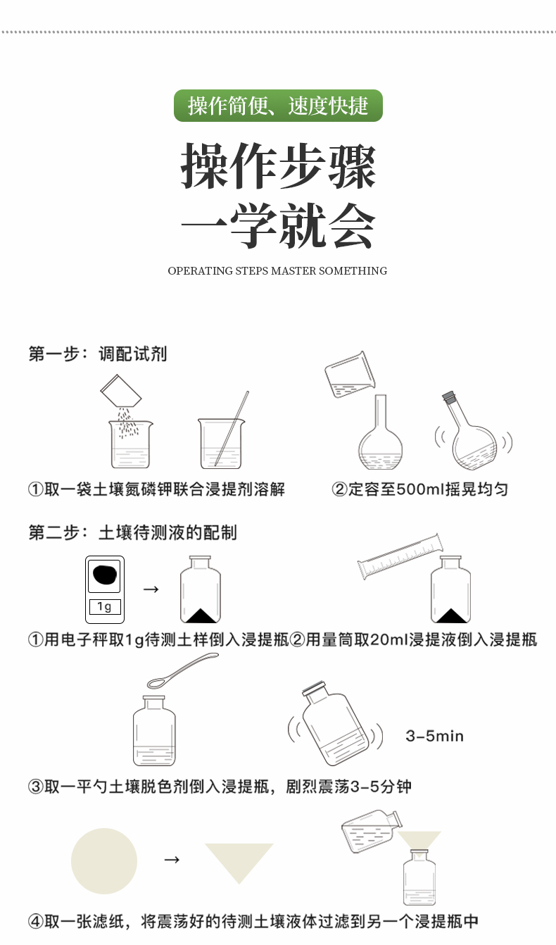 | 全項(xiàng)目土壤肥料養(yǎng)分速測(cè)儀功能全:測(cè)試項(xiàng)目國(guó)內(nèi)外*全(各類藥劑均可選購(gòu))。 | 配套齊全:該儀器集藥、器、儀為一體,攜帶方便,相當(dāng)于一個(gè)小型實(shí)驗(yàn)室。適于農(nóng)業(yè)服務(wù)部門或農(nóng)資經(jīng)銷商、肥料廠商測(cè)土施肥和鑒別肥料真假。 | 操作簡(jiǎn)便、速度快捷,成品藥劑開(kāi)瓶即用,無(wú)須配置。 |
