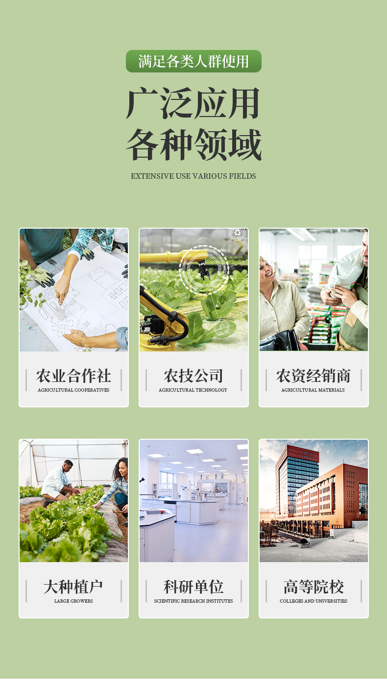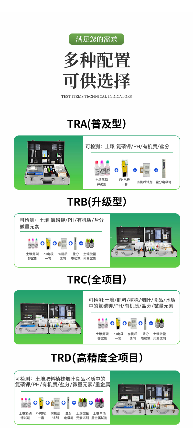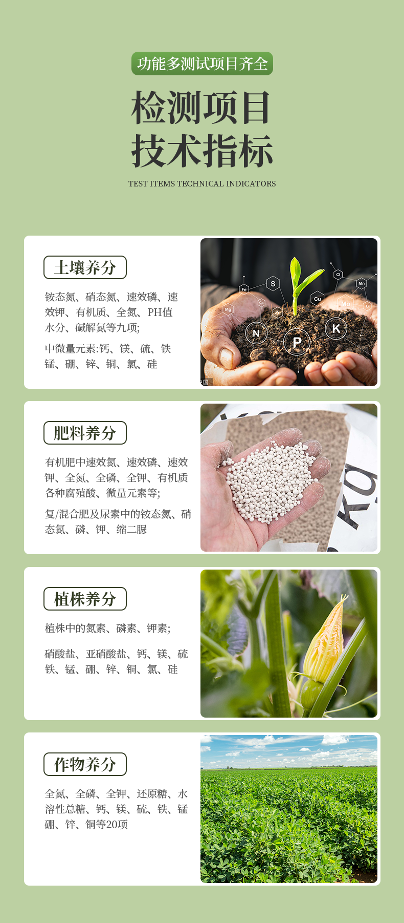 | 土壤養(yǎng)分:●銨態(tài)氮、硝態(tài)氮、速效磷、速效鉀、有機(jī)質(zhì)、全氮、堿解氮、pH值、含鹽量、水分等十項(xiàng); ● 中微量元素:鈣、鎂、硫、鐵、錳、硼、鋅、銅、氯、硅等。 | 肥料養(yǎng)分:● 單質(zhì)化肥中的氮、磷、鉀; ● 復(fù)(混)合肥及尿素中的銨態(tài)氮、硝態(tài)氮、磷、鉀、縮二脲; ● 有機(jī)肥中速效氮、速效磷、速效鉀、全氮、全磷、全鉀、有機(jī)質(zhì),各種腐植酸、微量元素(鈣、鎂、硫、鐵、錳、硼、鋅、銅、氯、硅)等。 | 植株養(yǎng)分:● 植株中的氮素、磷素、鉀素;硝酸鹽、亞硝酸鹽;鈣、鎂、硫、鐵、錳、硼、鋅、銅、氯、硅等項(xiàng)。 | 煙葉養(yǎng)分:全氮、全磷、全鉀、還原糖、水溶性總糖、硼、錳、鐵、銅、鈣、鎂等20項(xiàng)。 |