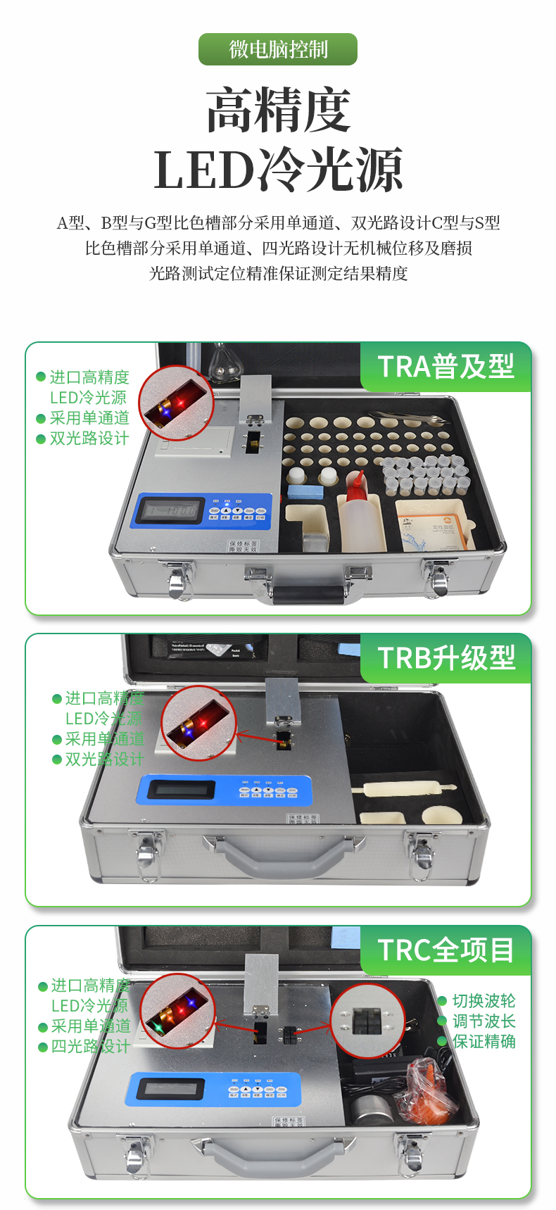 | 《機(jī)箱/藥劑一體式鋁合金機(jī)箱》設(shè)計(jì),便于攜帶、堅(jiān)固耐用,配套成品藥劑。 | 微電腦控制,數(shù)字化線路、程序化設(shè)計(jì),液晶顯示,交直流兩用,可野外流動(dòng)測(cè)試,大程度降低操作者的失誤和勞動(dòng)強(qiáng)度。 | 分辨率:0.001,觸摸式按鍵,內(nèi)置熱敏打印機(jī),可打印測(cè)試結(jié)果。 | 全項(xiàng)目土壤肥料養(yǎng)分速測(cè)儀可檢測(cè)土壤及化肥、有機(jī)肥(含葉面肥、水溶肥、噴施肥等)、植株中的速效氮、速效磷、有效鉀、全氮、全磷、全鉀、有機(jī)質(zhì)、酸堿度,鈣、鎂、硫、鐵、錳、硼、鋅、銅、氯、硅等各種中微量元素。 | 采用高亮LED光源,濾光式處理,保證光源波長(zhǎng)穩(wěn)定, 硅半導(dǎo)體作為信號(hào)接收系統(tǒng), 壽命長(zhǎng)達(dá)10萬(wàn)小時(shí)級(jí)別。光源穩(wěn)定,重現(xiàn)性好,準(zhǔn)確度高。 | 比色槽部分采用單通道設(shè)計(jì),無(wú)機(jī)械位移及磨損,光路測(cè)試定位**,保證測(cè)定結(jié)果精度。 | 配套專家施肥系統(tǒng)數(shù)據(jù),可對(duì)百余種全國(guó)農(nóng)業(yè)、果樹(shù)、 經(jīng)濟(jì)作物的目標(biāo)產(chǎn)量科學(xué)計(jì)算推薦施肥量。 |