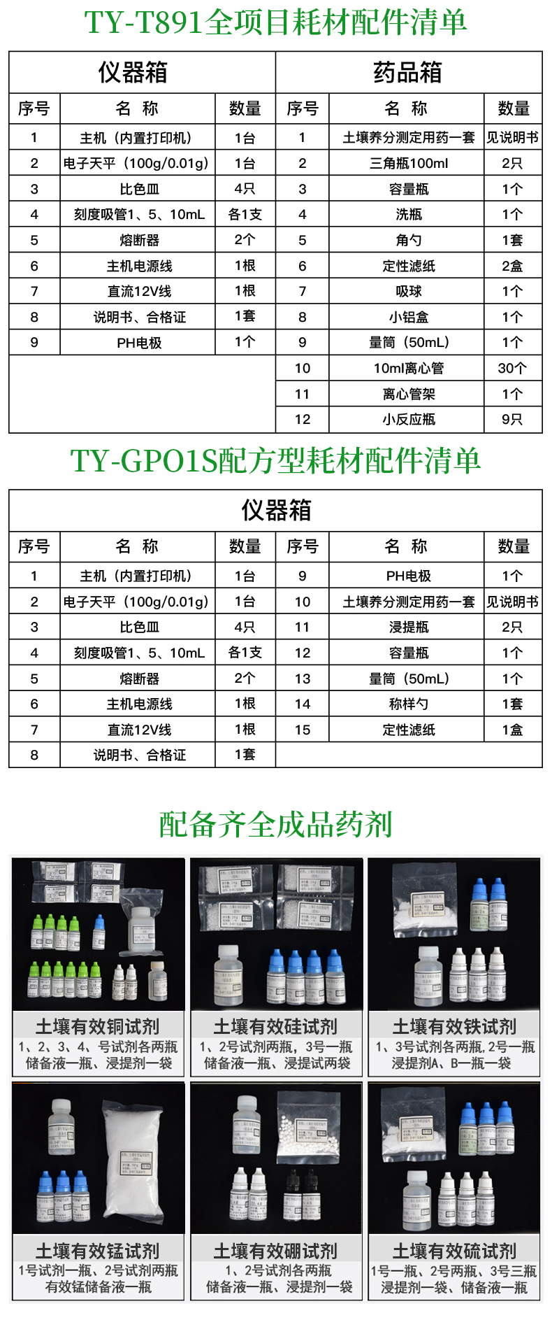 | 儀器整機(jī)質(zhì)保五年,終身免費(fèi)維修服務(wù),免費(fèi)郵寄儀器、免費(fèi)培訓(xùn)。 | 終身免費(fèi)提供土肥等農(nóng)業(yè)相關(guān)技術(shù)支持! | 土壤養(yǎng)分檢測(cè)儀配置清單(兩個(gè)鋁合金箱子): |