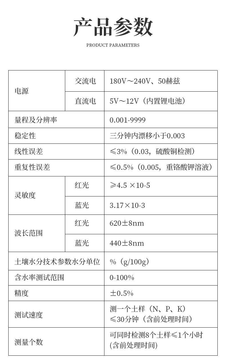 | 電源:交流 220±22V 直流 12V+5V(可用車載電源也可選擇儀器內(nèi)置鋰電池) | 功率: ≤5W | 量程及分辨率:0.001-9999 | 重復(fù)性誤差: ≤0.3%(0.003,重鉻酸鉀溶液) | 儀器穩(wěn)定性:三分鐘內(nèi)漂移小于0.2%(0.002,透光度測(cè)量)。儀器開機(jī)預(yù)熱5分鐘后,兩分鐘內(nèi)顯示數(shù)字無漂移(透光度測(cè)量),五分鐘內(nèi)數(shù)字漂移不超過0.3%(透光度測(cè)量);二十分鐘內(nèi)數(shù)字漂移不超過0.5%(透光度測(cè)量)、0.001(吸光度測(cè)量);三十分鐘內(nèi)數(shù)字漂移不超過0.7%(透光度測(cè)量)、0.002(吸光度測(cè)量)。 | 線性誤差: ≤1%(0.01,硫酸銅檢測(cè)) | 靈敏度:紅光≥4.5 ×10-5 藍(lán)光≥3.17×10-3 綠光≥2.35×10-3 橙光≥2.13×10-3 | 波長(zhǎng)范圍 :紅光:680±2nm; 藍(lán)光:420±2nm;綠光:510±2nm;橙光:590±4nm | PH值(酸堿度): (1)測(cè)試范圍:1~14 (2)精度:0.1 (3)誤差:±0.1(擴(kuò)展) | 含鹽量(電導(dǎo)):(1)測(cè)試范圍:0.01%~1.00% (2)相對(duì)誤差:±5% | 土壤水分技術(shù)參數(shù)水分單位:﹪(g/100g);含水率測(cè)試范圍:0-100﹪;誤差小于0.5% | 土壤中速效N、P、K三種養(yǎng)分一次性同時(shí)浸提測(cè)定、科學(xué)指導(dǎo)施肥量 | 肥料中氮(N)、磷(P)、鉀(K)等養(yǎng)分同時(shí)、快速、準(zhǔn)確檢測(cè) | 測(cè)試速度:測(cè)一個(gè)土樣(N、P、K)≤30分鐘(含前處理時(shí)間,不需用戶提供任何附件) | 同時(shí)測(cè)8個(gè)土樣≤1小時(shí)(含前處理時(shí)間) | 數(shù)據(jù)打印:內(nèi)置**一鍵式熱敏打印機(jī) |