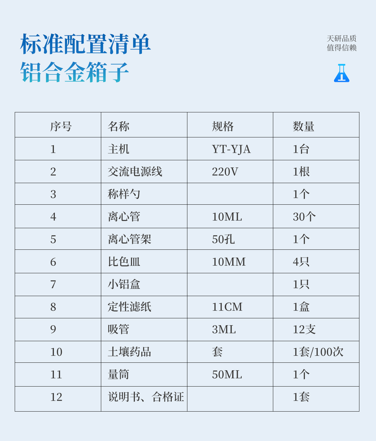 | 名稱 | 主機(jī) | 交流電源線 | 稱樣勺 | 離心管 | 離心管架 | 比色皿 | 小鋁盒 | 定性濾紙 | 吸管 | 土壤藥品 | 量筒 | 說(shuō)明書、合格證 |