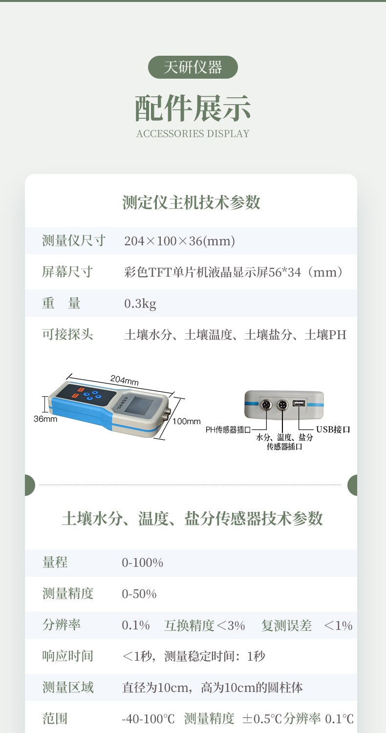| 測(cè)量參數(shù):土壤容積含水量; | 單位:%(m3/m3); | 測(cè)試靈敏度:±0.01 %(m3/m3); | 量程:0-100%(m3/m3); | 測(cè)量精度:0-50%(m3/m3)范圍內(nèi))±2%(m3/m3);50-100%(m3/m3)范圍內(nèi))±3%(m3/m3); | 分辨率:0.1% | 測(cè)量區(qū)域:90%的影響在圍繞中央探針直徑為3cm長為6cm的圓柱體內(nèi); | 穩(wěn)定時(shí)間:通電后約10秒鐘; | 響應(yīng)時(shí)間:響應(yīng)在1秒鐘內(nèi)進(jìn)入穩(wěn)定過程; | 供電方式:鋰電池或交流電 | 通訊方式:USB2.0 | 軟件: 上位機(jī)軟件免費(fèi)贈(zèng)送 | 線纜: 水分國標(biāo)屏蔽線2米,溫度聚四氟耐高溫導(dǎo)線2米。 | 測(cè)量方式:插入式、埋藏式、剖面等 |
